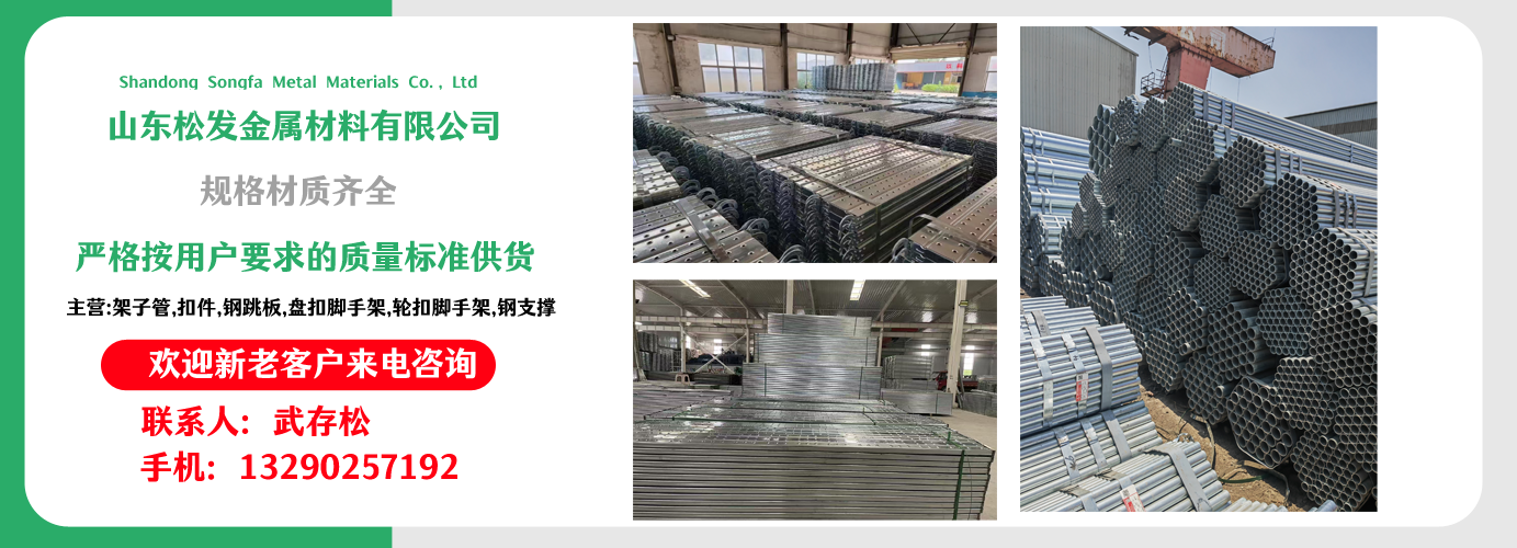 山東松發(fā)金屬材料有限公司主營架子管,扣件,鋼跳板,盤扣腳手架,輪扣腳手架,鋼支撐生產廠家。本廠專業(yè)生產銷售。 建筑用架子管、 主要用于房建,橋梁,鐵路,公路,地鐵,水庫,隧道,支撐。 架子管,扣件,鋼跳板,盤扣腳手架,輪扣腳手架,鋼支撐的優(yōu)越性及應用“ ”產品因具有結構簡單合理、設計巧妙、使用方便、安全、快捷、易于運輸、儲存、維護簡單等特點。 公司一貫堅持“質量,用戶至上,優(yōu)質服務,信守合同”的宗旨,憑借著高質量的產品,良好的信譽,優(yōu)質的服務,產品暢銷全球。歡迎廣大客戶來電洽談,共同發(fā)展,共創(chuàng)輝煌! 山東松發(fā)金屬材料有限公司秉承誠信服務、恪守信譽的宗旨,在同等的質量下,保證以最低的價格,最完善的服務,最高的信譽來答謝各界朋友的支持和厚愛,歡迎您的來電、咨詢,我們將竭誠為您服務!...